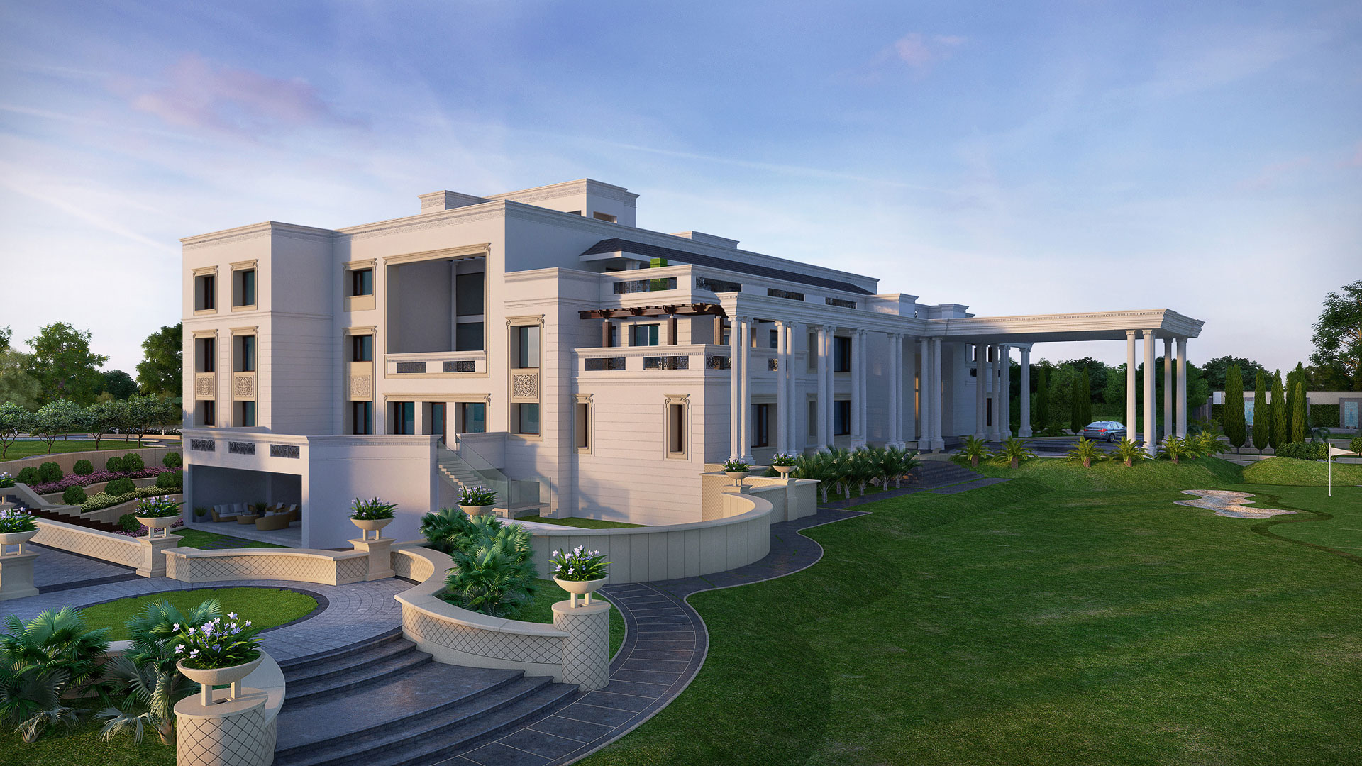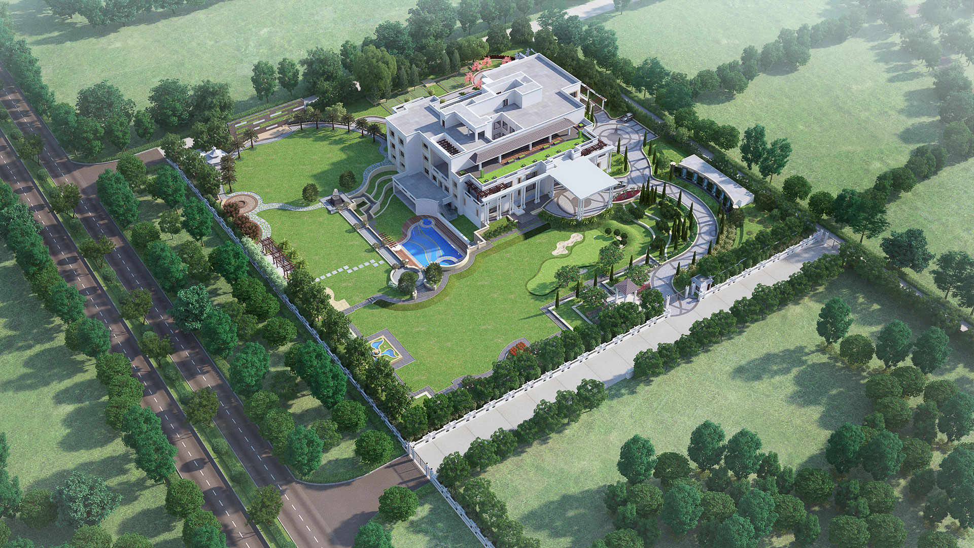 A private farmhouse residence for Mr. Robin Kasna, the project is located in lush green surrounds at Builder’s Area in Bhagmalpuram, Greater Noida. It offers generous living spaces carefully zoned and positioned to get maximum benefit of climatic conditions and surrounding landscape. This amazing dream home called the Kasana Villa sprawls across 3.9 acres of lush green landscape and has been designed with Vaastu as one of the top most considerations. Landscaped outdoors form a major highlight of the project and boast of large open lawns, water bodies & fountains, a swimming pool & club, a putting green, a performance area with stage, a bon-fire pit, sit-out spaces, herbal gardens etc: that provide a host of interesting spaces to engage with and further help to define private and semi-private zones and entry points throughout the site.