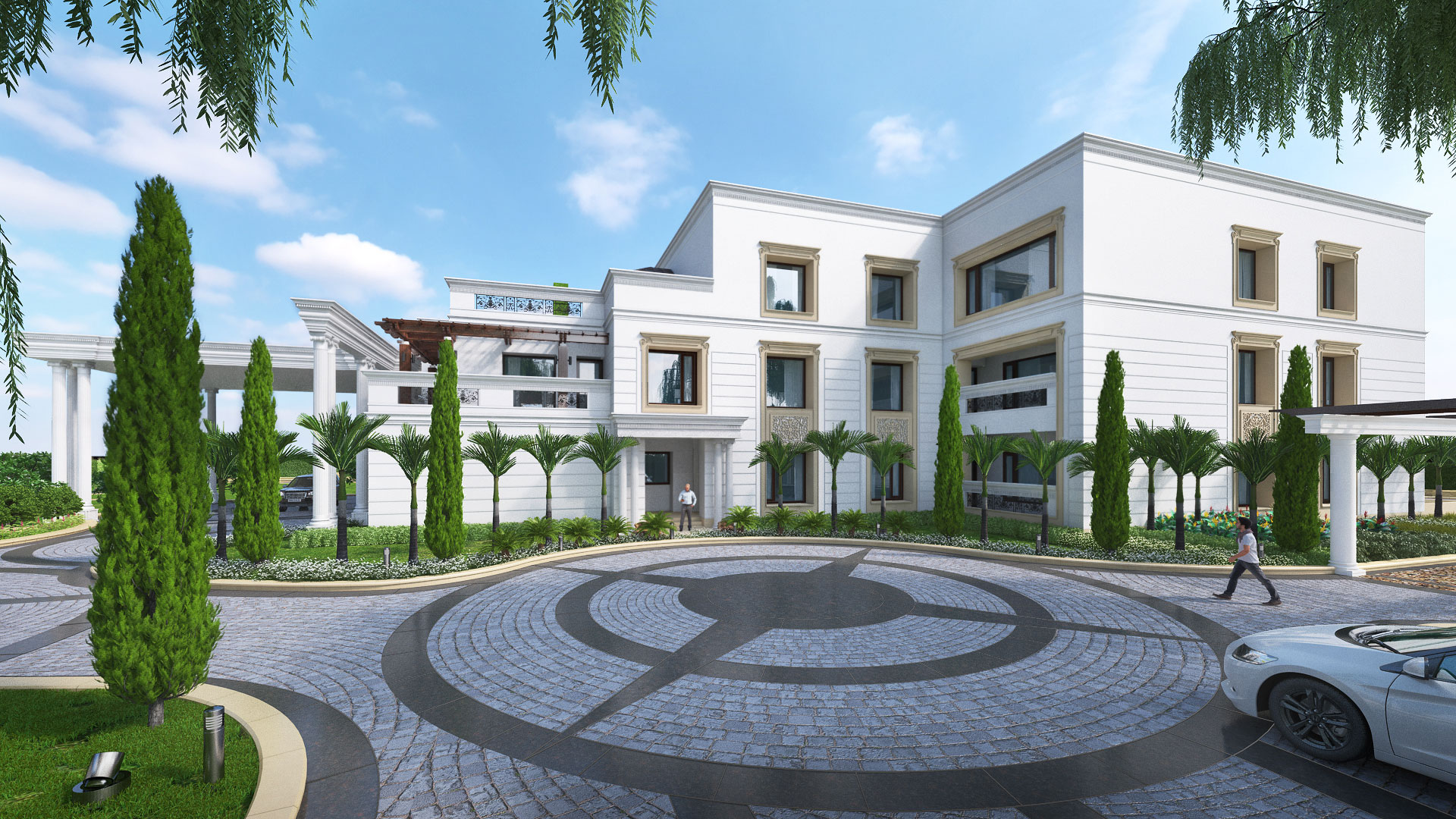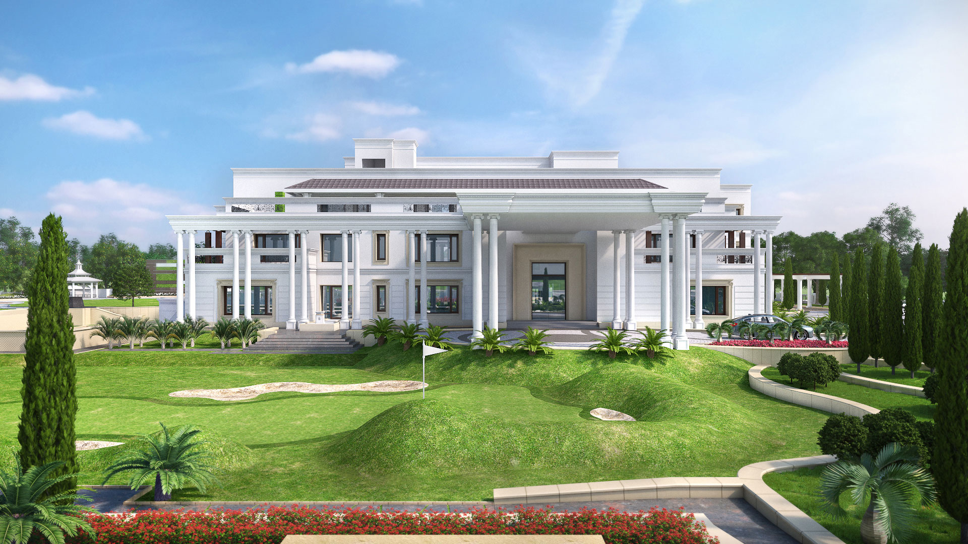 The main entrance of the plot is towards North side with a circular approach road leading to a double height entry porch that adds to the grandness of the villa. The double height twin columns perfectly balance the off centered main entrance of the house. The villa offers 11 bedrooms with indoor/ outdoor living areas and large entertainment spaces. To connect the interior spaces to the outdoors, terraces have been provided at first and second floor levels and a courtyard in the center. On the exterior, all major living areas and terraces enjoy unobstructed views of the surrounding greens. Interior spaces open into a central courtyard overlooking a palatial double height living area. The building itself has been positioned off center to give way to a large front lawn. For the outdoor landscape, simple textures and materials have been used with extensive landscaping and plantation to add sculptural and foliage accents.